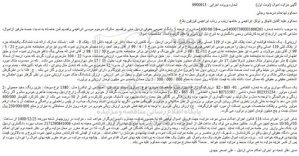 آگهی مزایده اموال (نوبت اول)                شماره پرونده اجرایی : 9900913