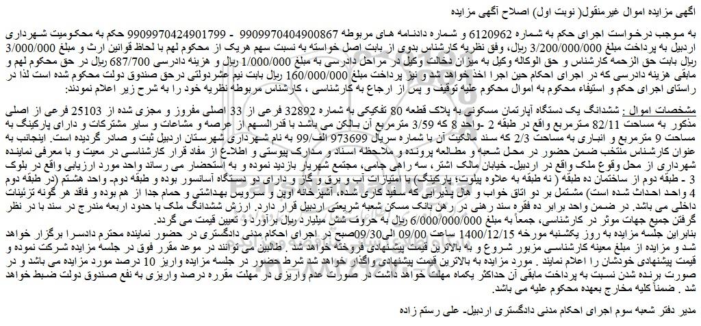 به موجب درخواست اجرای حکم به شماره 6120962 و شماره دادنامه های مربوطه 9909970404900867 - 9909970424901799 حکم به محکومیت شهرداری اردبیل به پرداخت مبلغ 3/200/000/000 ریال، وفق نظریه کارشناس بدوی از بابت اصل خواسته به نسبت سهم هریک از محکوم لهم با لحاظ قوانین ارث و مبلغ 3/000/000 ریال بابت حق الزحمه کارشناس و حق الوکاله وکیل به میزان دخالت وکیل در مراحل دادرسی به مبلغ 1/000/000 ریال و هزینه دادرسی 687/700 ریال در حق محکوم لهم و مابقی هزینه دادرسی که در اجرای احکام حین اجرا اخذ خواهد شد و نیز پرداخت مبلغ 160/000/000 ریال بابت نیم عشردولتی درحق صندوق دولت محکوم شده است لذا در راستای اجرای حکم و استیفاء محکوم به اموال محکوم علیه توقیف و پس از ارجاع به کارشناسی ، کارشناس مربوطه نظریه خود را به شرح زیر اعلام نمودند: