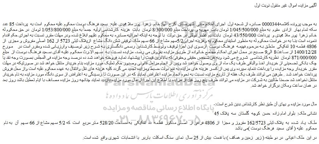 به موجب پرونده کلاسه0000344 صادره از شعبه اول  اجرای احکام مدنی  شهرستان  کرج  لها: خانم  زهرا  پور ملا محمدی علیه:  سعید فرهنگ دوست محکوم علیه محکوم  است به  پرداخت 85 عدد سکه تمام بهار  ازادی  مقوم  به مبلغ 1/045/500/000 تومان بابت  مهریه و  پرداخت مبلغ 8/300/000 تومان  بابت  هزینه  کارشناسی اولیه  جمعاً به مبلغ 1/053/800/000 تومان  در حق محکوم له خانم زهرا  پور ملا محمدی و  پرداخت 43/550/000 تومان  بابت نیم عشر دولتی در حق دولت  با توجه به اینکه اجرائیه صادره به محکوم علیهم ابلاغ شده ودر مهلت مقرر نسبت به اجرای حکم اقدام ننموده است بنا به در خواست محکوم له به منظور استیفای محکوم به وهزینه اجرایی5/2سهم مشاع از 66 سهم ملک توقیفی شش دانگ مشاع  ازپلاک ثبتی 5723 از 162 اصلی مفروش و مجزی  از 4806 قطعه 10 تفکیکی  متعلق به مرحوم فهیمه  فرهنگ دوست  ازسوی این اجرا توقیف وتوسط کارشناس رسمی دادگستری به شرح زیر توصیف وارزیابی شده ومقرر است در    مورخ 1400/12/28 از ساعت8 الی9 صبح در محل اجرای احکام مجتمع خانواده از طریق مزایده بفروش می رسد، مزایده نسبت به  سهم الارث محکوم علیه آقای سعید فرهنگ دوست از  مبلغ 871/000/000 تومان  نظریه کارشناسی  شروع می شود وبه هر شخص حقیقی وحقوقی که بالاترین قیمت را پیشنهاد نماید فروخته خواهد شد ده درصد وجه مزایده فی المجلس بصورت وجه نقد یا چک بانکی تضمینی از خریدار اخذ والباقی ظرف یک ماه از وی وصول خواهد شد وپس از انجام مراحل قانونی وصدور حکم تملیک مورد مزایده بنام خریدار منتقل خواهد شد در صورتیکه در مهلت مقرر خریدار وجه مزایده را پرداخت ننماید سپرده وی پس از کسر هزینه های مزایده به نفع دولت ضبط ومزایده تجدید می گردد کلیه هزینه های نقل وانتقال به عهده محکوم علیه است واز محل فروش پرداخت خواهد شد . طرفین می توانند ظرف یک هفته از تاریخ مزایده نسبت به نحوه انجام مزایده اعتراض نمایند که در این صورت تا رسیدگی به اعتراض از سوی دادگاه مورد مزایده به نام خریدار منتقل نخواهد شد ضمنا طالبین به شرکت در مزایده می توانند ظرف پنج روز قبل از مزایده با اطلاع این اجرا از مال مورد مزایده بازدید نمایند چنانچه روز مزایده مصادف با ایام تعطیل باشد روز بعد در همان ساعت ومکان برگزار خواهد شد.