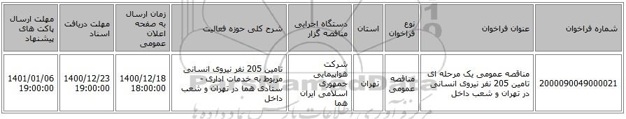 | 2000090049000021 | مناقصه عمومی یک مرحله ای تامین 205 نفر نیروی انسانی در تهران و شعب داخل | مناقصه عمومی | تهران | شرکت هواپیمایی جمهوری اسلامی ایران هما | تامین 205 نفر نیروی انسانی مربوط به خدمات اداری - ستادی هما در تهران و شعب داخل | 1400/12/18 18:00:00 | 1400/12/23 19:00:00 | 1401/01/06 19:00:00 |