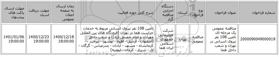 | 2000090049000019 | مناقصه عمومی یک مرحله ای تامین 108 نفر نیروی انسانی در تهران و شعب داخل هما | مناقصه عمومی | تهران | شرکت هواپیمایی جمهوری اسلامی ایران هما | تامین 108 نفر نیروی انسانی مربوط به خدمات حراست هما در تهران (فرودگاه های بین المللی مهرآباد و امام خمینی (ره)) و شعب داخل (اصفهان - اردبیل - اهواز - بوشهر - بیرجند - کرمانشاه - مشهد - آبادان - بندرعباس - گرگان - لار - شیراز - کرمان - ارومیه) | 1400/12/18 18:00:00 | 1400/12/23 19:00:00 | 1401/01/06 19:00:00 |