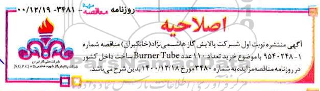 اگهی منتشره نوبت اول شرکت پالایش گاز هاشمی نژاد ( خانگیران ) مناقصه شماره 9540248-1 با موضوع خرید تعداد 110 عدد  burner tube  ساخت داخل کشور در روزنامه مناقصه و مزایده به شماره 3480 مورخ 1400.12.18 بدین شرح می باشد
