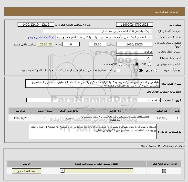 شرح کلی نیاز: طراحی و احداث نیروگاه برق خورشیدی با ظرفیت 20 کیلو وات در ساختمان الف طبق سند قرارداد حاضر و براساس شرح کار و شرایط خصوصی منضم به آن