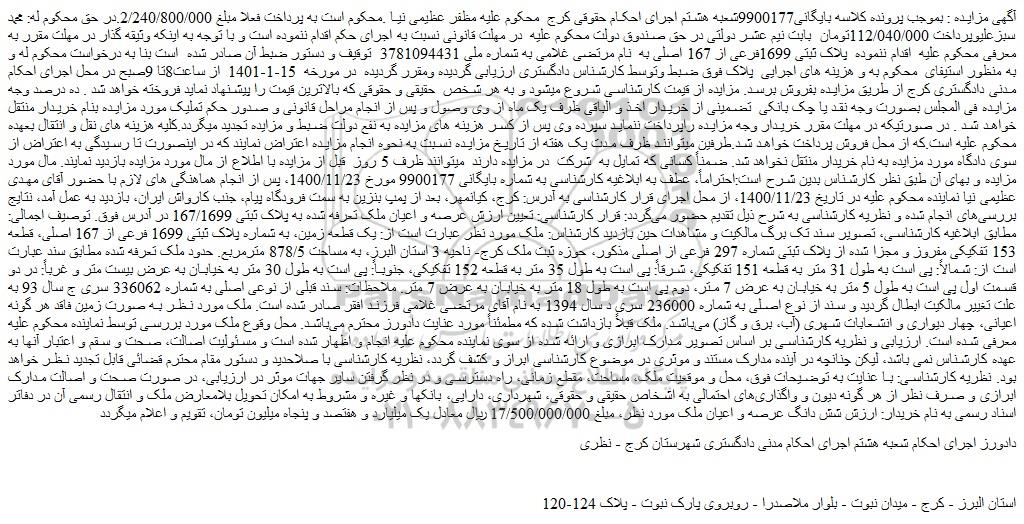 مزایده فروش پلاک ثبتی 1699فرعی از 167 اصلی , مزایده فروش پلاک ثبتی 1699فرعی از 167 اصلی