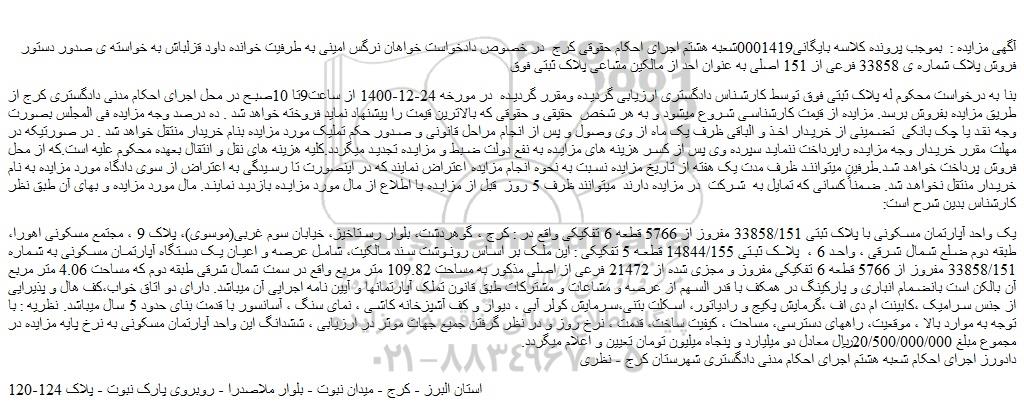 آگهی مزایده : بموجب پرونده کلاسه بایگانی0001419شعبه هشتم اجرای احکام حقوقی کرج در خصوص دادخواست خواهان نرگس امینی به طرفیت خوانده داود قزلباش به خواسته ی صدور دستور فروش پلاک شماره ی 33858 فرعی از 151 اصلی به عنوان احد از مالکین مشاعی پلاک ثبتی فوق