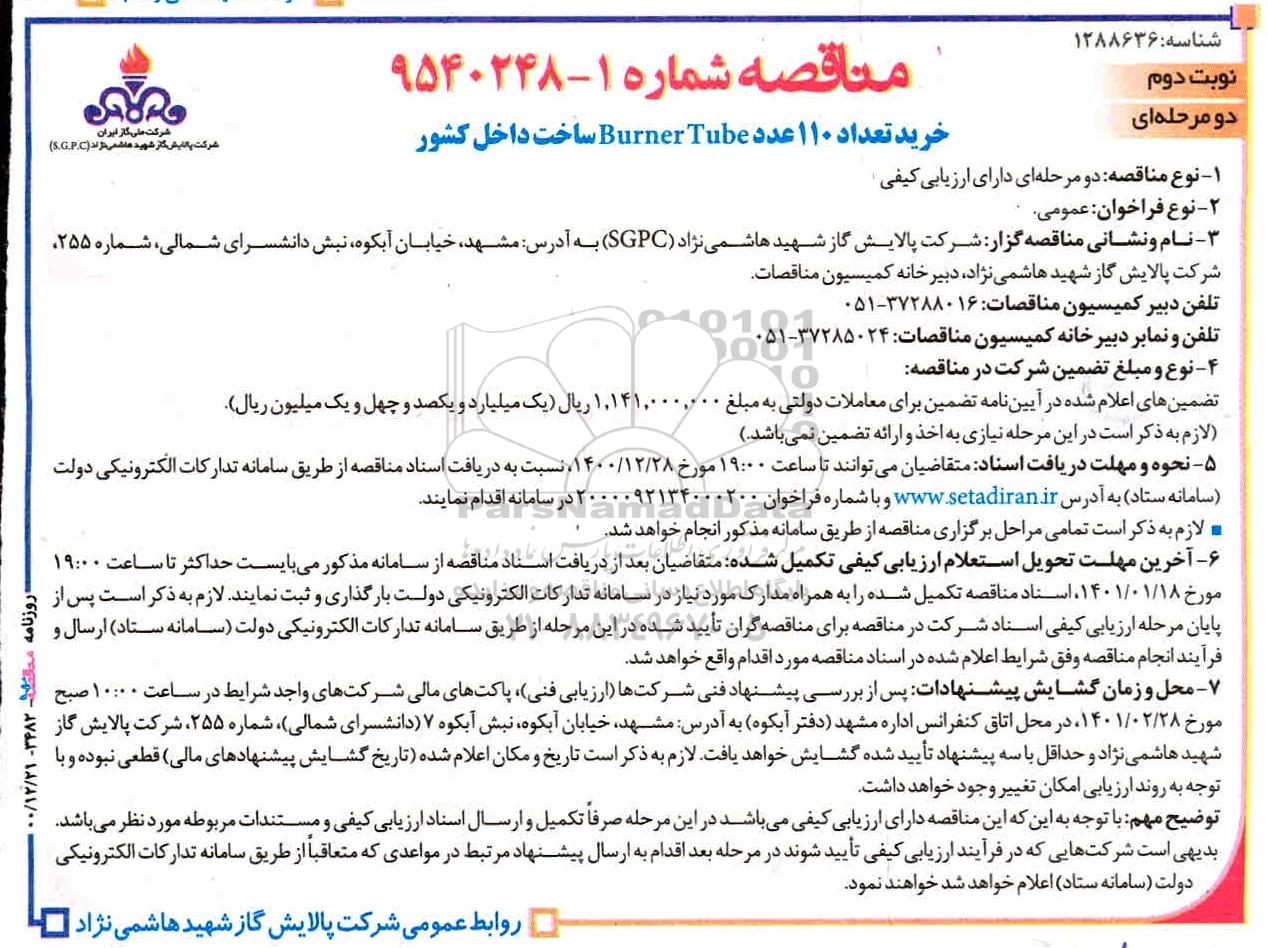 علاقهمندان میتوانند جهت دریافت اسناد و اطلاعات تکمیلی، مناقصه خرید تعداد 110 عدد Burner Tube ساخت داخل کشور نوبت دوم با سامانه مناقصات و مزایدات ایران پارسنماد داده ها 88349670 تماس حاصل نمایند.