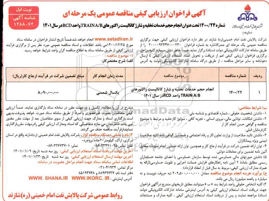 شماره 1400/24 تحت عنوان انجام حجم خدمات تخلیه و شارژ کاتالیست راکتورهای TRAINA / B واحد RCD در سال 1401