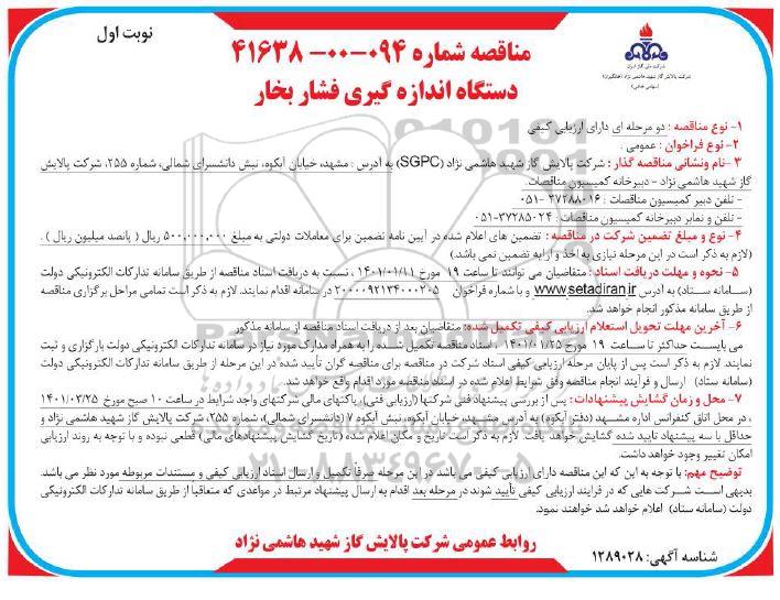 مناقصه دستگاه اندازه گیری فشار بخار از کلیه افراد متخصص و شرکتها واجد شرایط دعوت به عمل میآید در مناقصه با کد خبرگزاری پارس نماد: 4346007 شرکت نمایند.