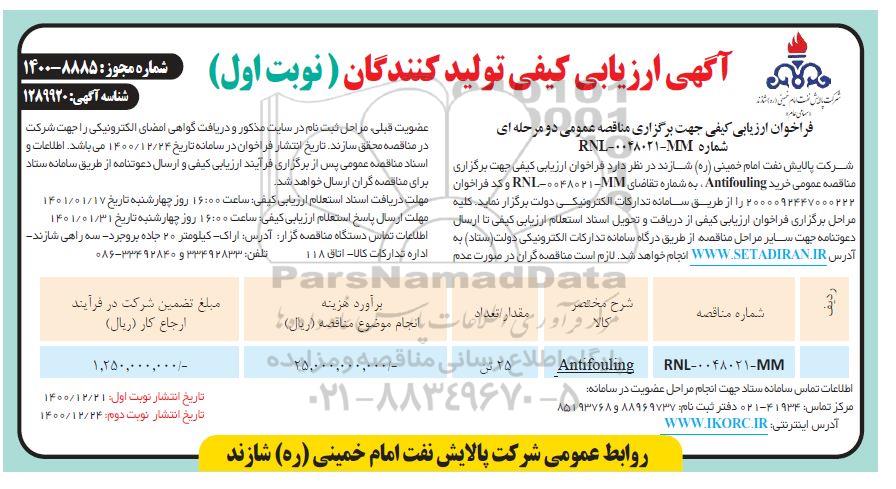 شرکت پالایش نفت امام خمینی (ره) شازند در نظر دارد فراخوان ارزیابی کیفی جهت برگزاری مناقصه عمومی خرید عایق کلسیم سیلیکات به شماره RNL - 0048021- MM و کد فراخوان 2000092447000222 را از طریق سامانه تدارکات الکترونیکی دولت برگزار نماید. کلیه مراحل برگزاری فراخوان ارزیابی کیفی از دریافت و تحویل اسناد استعلام ارزیابی کیفی تا ارسال دعوتنامه جهت سایر مراحل مناقصه از طریق درگاه سامانه تدارکات الکترونیکی دولت ستاد به آدرس ستاد ایران انجام خواهد شد. لازم است مناقصه گران در صورت عدم عضویت قبلی مراحل ثبت نام در سایت مذکور و دریافت گواهی امضای الکترونیکی را جهت شرکت در مناقصه محقق سازند. تاریخ انتشار فراخوان در سامانه تاریخ 1400.11.20 می باشد. اطلاعات و اسناد تجدید مناقصه عمومی پس از برگزاری فرآیند ارزیابی کیفی و ارسال دعوتنامه از طریق سامانه ستاد به مناقصه گران ارسال خواهد شد.