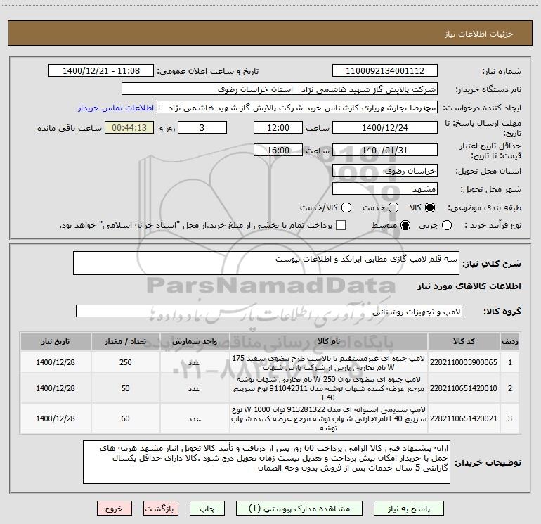 شرح کلی نیاز: سه قلم لامپ گازی مطابق ایرانکد و اطلاعات پیوست
