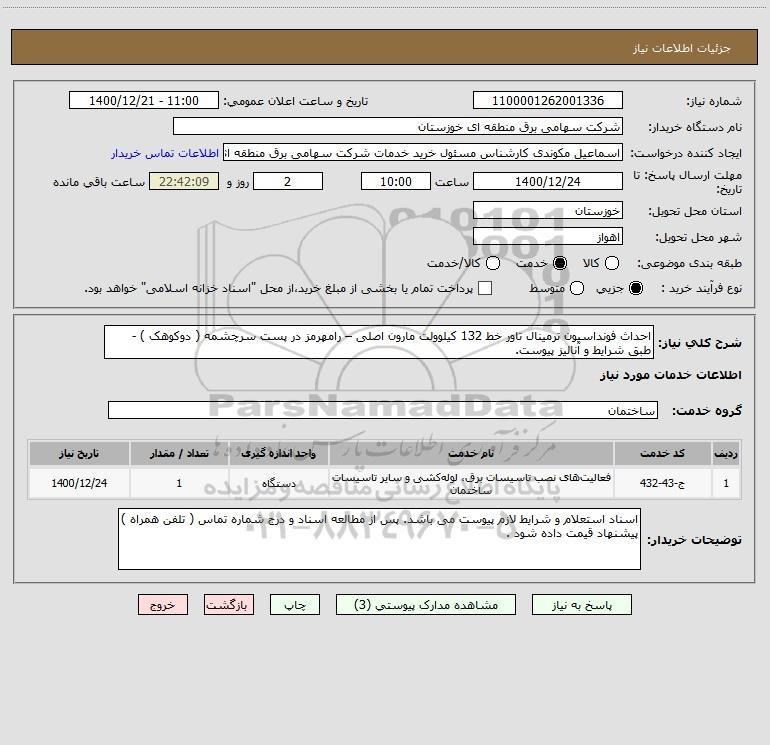 شرح کلی نیاز: احداث فونداسیون ترمینال تاور خط 132 کیلوولت مارون اصلی – رامهرمز در پست سرچشمه ( دوکوهک ) - طبق شرایط و آنالیز پیوست.