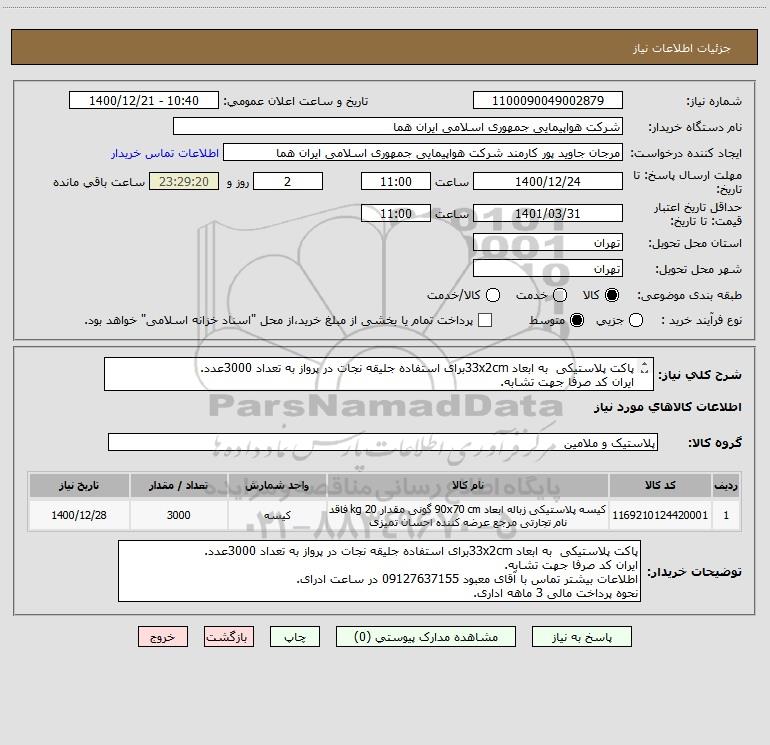 شرح کلی نیاز: پاکت پلاستیکی به ابعاد 33x2cmبرای استفاده جلیقه نجات در پرواز به تعداد 3000عدد.