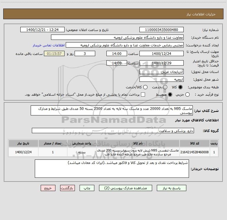 شرح کلی نیاز: ماسک N95 به تعداد 20000 عدد و ماسک سه لایه به تعداد 2500 بسته 50 عددی طبق شرایط و مدارک پیوستی