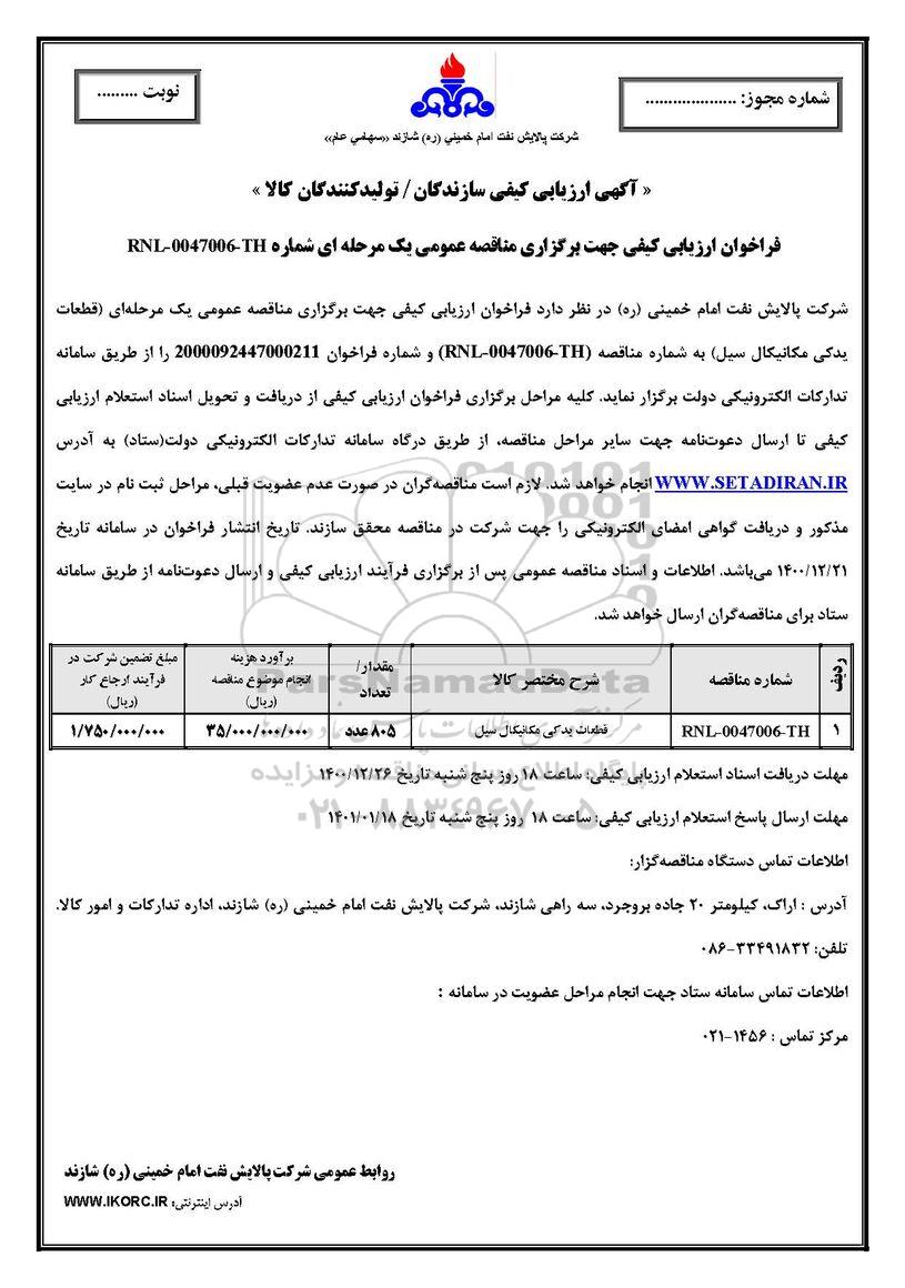 شرکت پالایش نفت امام خمینی (ره) در نظر دارد فراخوان ارزیابی کیفی جهت برگزاری مناقصه عمومی یک مرحله ای قطعات یدکی مکانیکال سیل به شماره مناقصه RNL-0047006-TH و شماره فراخوان 2000092447000211