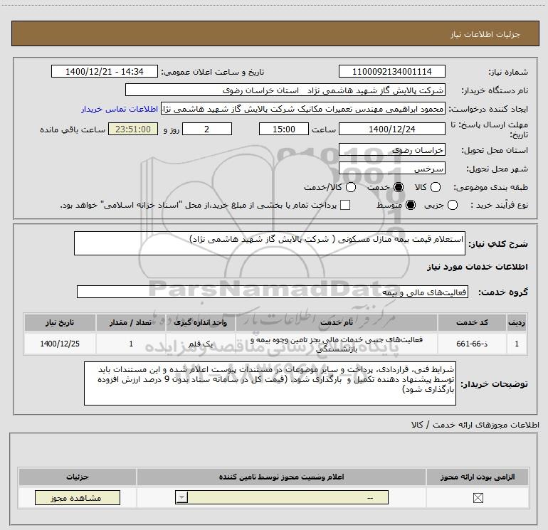 شرح کلی نیاز: استعلام قیمت بیمه منازل مسکونی ( شرکت پالایش گاز شهید هاشمی نژاد)