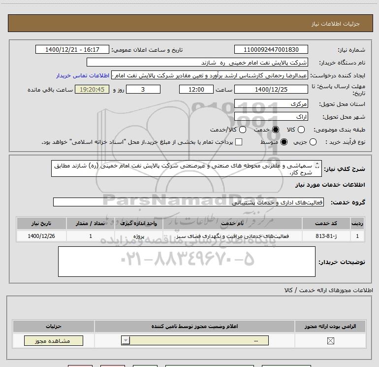 شرح کلی نیاز: سمپاشی و علفزنی محوطه های صنعتی و غیرصنعتی شرکت پالایش نفت امام خمینی (ره) شازند مطابق شرح کار،