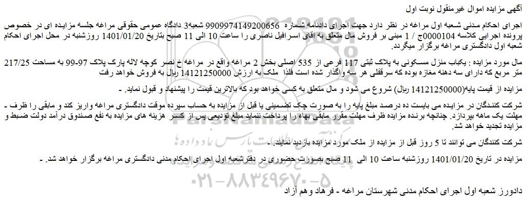 مال مورد مزایده : یکباب منزل مسکونی به پلاک ثبتی 117 فرعی از 535 اصلی بخش 2 مراغه واقع در مراغه خ نصر کوچه لاله پارک پلاک 97-99 به مساحت 217/25 متر مربع که دارای سه دهنه مغازه بوده که سرقفلی هر سه واگذار شده است فلذا  ملک به ارزش 14121250000 ریال به فروش خواهد رفت
