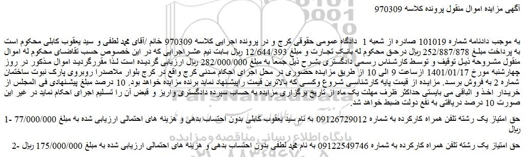 به موجب دادنامه شماره 101019 صادره از شعبه 1  دادگاه عمومی حقوقی کرج و در پرونده اجرایی کلاسه 970309 خانم /آقای محمد لطفی و سید یعقوب کابلی محکوم است به پرداخت مبلغ 252/887/878 ریال درحق محکوم له بانک تجارت و مبلغ 12/644/393 ریال بابت نیم عشراجرایی که در این خصوص حسب تقاضای محکوم له اموال منقول مشروحه ذیل توقیف و توسط کارشناس رسمی دادگستری بشرح ذیل جمعاً به مبلغ 282/000/000 ریال ارزیابی گردیده است لذا مقررگردید اموال مذکور در روز چهارشنبه مورخ 1401/01/17 ازساعت 9 الی 10 از طریق مزایده حضوری در محل اجرای احکام مدنی کرج واقع در کرج بلوار ملاصدرا روبروی پارک نبوت ساختمان شماره 2 به فروش برسد. مزایده از قیمت پایه کارشناسی شروع وکسی که بالاترین قیمت راپیشنهاد نماید برنده مزایده خواهد بود. 10 درصد مبلغ پیشنهادی فی المجلس از خریدار اخذ و الباقی می بایستی حداکثر ظرف مهلت یک ماه از تاریخ برگزاری مزایده به حساب سپرده دادگستری واریز و قبض آن را تسلیم اجرای احکام نماید در غیر این صورت 10 درصد دریافتی به نفع دولت ضبط خواهد شد.