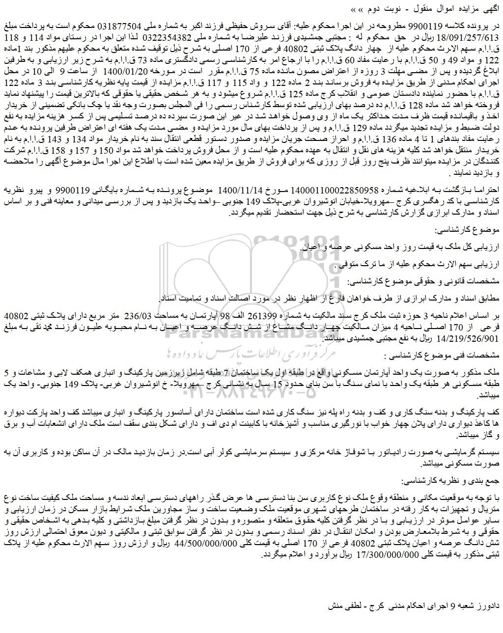 در پرونده کلاسه 9900119 مطروحه در این اجرا محکوم علیه: آقای سروش حفیظی فرزند اکبر به شماره ملی 031877504 محکوم است به پرداخت مبلغ 18/091/257/613 ریال در حق محکوم له : مجتبی جمشیدی فرزند علیرضا به شماره ملی 0322354382 لذا این اجرا در رستای مواد 114 و 118 ق.ا.ا.م سهم الارث محکوم علیه از چهار دانگ پلاک ثبتی 40802 فرعی از 170 اصلی به شرح ذیل توقیف شده متعلق به محکوم علیهم مذکور بند 1ماده 122 و مواد 49 و 50 ق.ا.ا.م با رعایت مفاد 60 ق.ا.ا.م را با ارجاع امر به کارشناسی رسمی دادگستری ماده 73 ق.ا.ا.م به شرح زیر ارزیابی و به طرفین ابلاغ گردیده و پس از مضی مهلت 3 روزه از اعتراض مصون مانده ماده 75 ق.ا.ا.م مقرر است در مورخه 1400/01/20 از ساعت 9 الی 10 در محل اجرای احکام مدنی از طریق مزایده به فروش برساند بند 2 ماده 122 و واد 115 و 117 ق.ا.ا.م مزایده از قیمت پایه نظریه کارشناسی بند 3 ماده 122 ق.ا.ا.م با حضور نماینده دادستان عمومی و انقلاب کرج ماده 125 ق.ا.ا.م شروع میشود و به هر شخص حقیقی یا حقوقی که بالاترین قیمت را پیشنهاد نماید فروخته خواهد شد ماده 128 ق.ا.ا.م ده درصد بهای ارزیابی شده توسط کارشناس رسمی را فی المجلس بصورت وجه نقد یا چک بانکی تضمینی از خریدار اخذ و باقیمانده قیمت ظرف مدت حداکثر یک ماه از وی وصول خواهد شد در غیر این صورت سپرده ده درصد تسلیمی پس از کسر هزینه مزایده به نفع دولت ضبط و مزایده تجدید میگردد ماده 129 ق.ا.ا.م و پس از پرداخت بهای مال مورد مزایده و مضی مدت یک هفته ای اعتراض طرفین پرونده به عدم رعایت مفاد بندهای 1 تا 4 ماده 136 ق.ا.ا.م و احراز صحت جریان مزایده و صدور دستور قطعی انتقال سند به نام خریدار مواد 134 و 143 ق.ا.ا.م به نام خریدار منتقل خواهد شد کلیه هزینه های نقل و انتقال به عهده محکوم علیه است و از محل فروش پرداخت خواهد شد مواد 150 و 157 و 158 ق.ا.ا.م شرکت کنندگان در مزایده میتوانند ظرف پنج روز قبل از روزی که برای فروش از طریق مزایده معین شده است با اطلاع این اجرا مال موضوع آگهی را ملاحضه و بازدید نمایند .