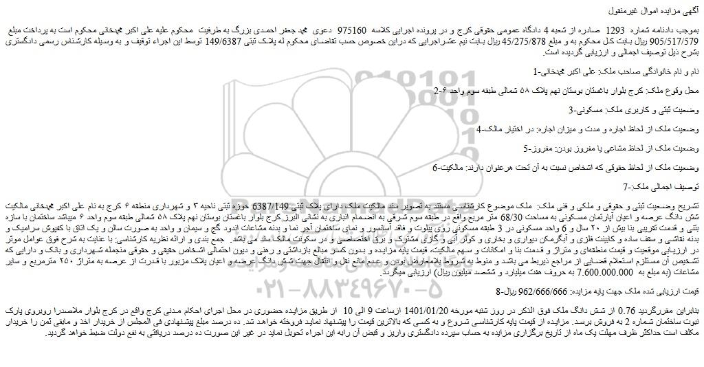 بموجب دادنامه شماره  1293  صادره از شعبه 4 دادگاه عمومی حقوقی کرج و در پرونده اجرایی کلاسه  975160  دعوی  محمد جعفر احمدی بزرگ به طرفیت  محکوم علیه علی اکبر محمدخانی محکوم است به پرداخت مبلغ  905/517/579 ریال بابت کل محکوم به و مبلغ 45/275/878 ریال بابت نیم عشراجرایی که دراین خصوص حسب تقاضای محکوم له پلاک ثبتی 149/6387 توسط این اجراء توقیف و به وسیله کارشناس رسمی دادگستری بشرح ذیل توصیف اجمالی و ارزیابی گردیده است.