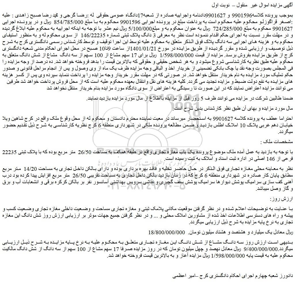 بموجب پرونده کلاسه9901596 و 9901627دادنامه واجراییه صادره از شعبه17دادگاه عمومی حقوقی  له :رضا گرجی و محمد رضا صبح زاهدی : علیه :اصغر قراگوزلو محکوم علیه محکوم است به پرداخت مبلغ در پرونده اجرایی 9901596 محکوم به با مبلغ 854/785/000  ریال و در پرونده اجرایی 9901627 محکوم به مبلغ 724/285/000  ریال به عنوان محکوم به و مبلغ5/100/000 ریال نیم عشر با توجه به اینکه اجراییه به محکوم علیه ابلاغ گردیده و در مهلت مقرر نسبت به اجرای حکم اقدام ننموده است نظر به معرفی 3 دانگ پلاک ثبتی شماره 146/22235  از سوی محکوم له و به منظور استیفای محکوم به و هزینه های اجرایی سه دانگ پلاک فوق الذکر متعلق به محکوم علیه توسط این اجرا توقیف و توسط کارشناس رسمی دادگستری کرج به شرح ذیل توصیف و ارزیابی شده و مقرر گردیده از طریق مزایده در مورخ 1401/01/21از ساعت 9تا10 صبح در محل اجرای احکام مدنی شعبه دادگستری کرج از طریق مزایده بفروش برسد. مزایده از قیمت 1/598/000/000  ریال برای 17 سهم مشاع از 100 سهم از سه دانگ  مشاع از شش دانگ متعلق به محکوم علیه طبق نظریه کارشناسی شروع میشود و به هر شخص حقیقی و حقوقی که بالاترین قیمت را بدهد فروخته خواهد شد. ده درصد از وجه مزایده را فی المجلس بصورت وجه نقد یا چک بانکی تضمینی از خریدار اخذ و الباقی وجه مزایده ظرف یک ماه از وی وصول و پس از انجام مراحل قانونی و صدور حکم تملیک مورد مزایده به نام خریدار منتقل خواهد شد. در صورتی که در مهلت مقرر خریدار وجه مزایده را پرداخت ننماید سپرده وی پس از کسر هزینه های مزایده به نفع دولت ضبط و مزایده تجدید می گردد. کلیه هزینه های نقل وانتقال بعهده محکوم علیه است که از محل فروش پرداخت خواهد شد طرفین    می توانند مزایده اعتراض نمایند که در این صورت تا رسیدگی به اعتراض از سوی دادگاه مورد مزایده بنام خریدار منتقل نخواهد شد