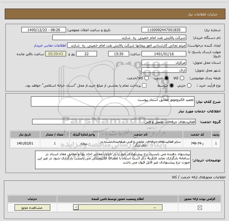 شرح کلی نیاز: تعمید الکتروموتور مطابق اسناد پیوست