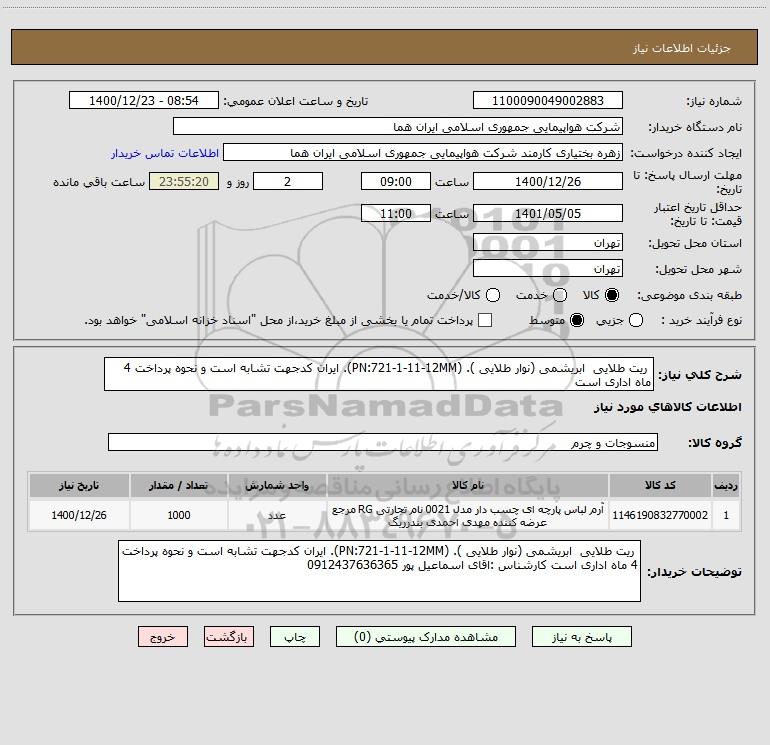 شرح کلی نیاز: ریت طلایی ابریشمی (نوار طلایی ). (PN:721-1-11-12MM). ایران کدجهت تشابه است و نحوه پرداخت 4 ماه اداری است