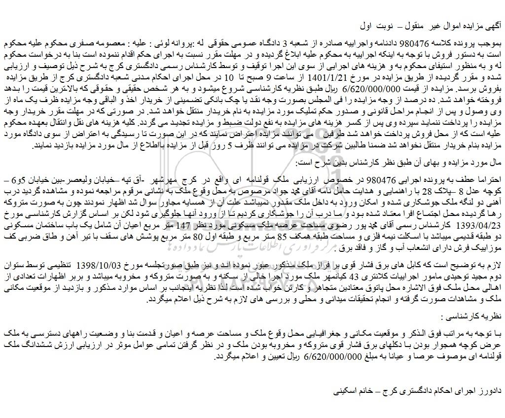 بموجب پرونده کلاسه 980476 دادنامه واجراییه صادره از شعبه 3 دادگاه عمومی حقوقی له :پروانه لوئی : علیه : معصومه صفری محکوم علیه محکوم است به دستور فروش با توجه به اینکه اجراییه به محکوم علیه ابلاغ گردیده و در مهلت مقرر نسبت به اجرای حکم اقدام ننموده است بنا به درخواست محکوم له و به منظور استیفای محکوم به و هزینه های اجرایی از سوی این اجرا توقیف و توسط کارشناس رسمی دادگستری کرج به شرح ذیل توصیف و ارزیابی شده و مقرر گردیده از طریق مزایده در مورخ 1401/1/21 از ساعت 9 صبح تا 10 در محل اجرای احکام مدنی شعبه دادگستری کرج از طریق مزایده بفروش برسد. مزایده از قیمت 6/620/000/000 ریال طبق نظریه کارشناسی شروع میشود و به هر شخص حقیقی و حقوقی که بالاترین قیمت را بدهد فروخته خواهد شد. ده درصد از وجه مزایده را فی المجلس بصورت وجه نقد یا چک بانکی تضمینی از خریدار اخذ و الباقی وجه مزایده ظرف یک ماه از وی وصول و پس از انجام مراحل قانونی و صدور حکم تملیک مورد مزایده به نام خریدار منتقل خواهد شد. در صورتی که در مهلت مقرر خریدار وجه مزایده را پرداخت ننماید سپرده وی پس از کسر هزینه های مزایده به نفع دولت ضبط و مزایده تجدید می گردد. کلیه هزینه های نقل وانتقال بعهده محکوم علیه است که از محل فروش پرداخت خواهد شد طرفین می توانند مزایده اعتراض نمایند که در این صورت تا رسیدگی به اعتراض از سوی دادگاه مورد مزایده بنام خریدار منتقل نخواهد شد ضمنا طالبین شرکت در مزایده می توانند ظرف 5 روز قبل از مزایده بااطلاع از مال مورد مزایده بازدید نمایند.