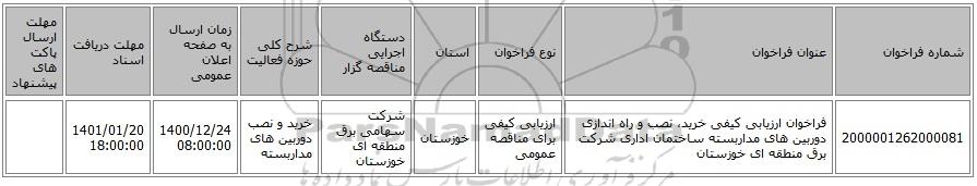 | 2000001262000081 | فراخوان ارزیابی کیفی خرید، نصب و راه اندازی دوربین های مداربسته ساختمان اداری شرکت برق منطقه ای خوزستان | ارزیابی کیفی برای مناقصه عمومی | خوزستان | شرکت سهامی برق منطقه ای خوزستان | خرید و نصب دوربین های مداربسته | 1400/12/24 08:00:00 | 1401/01/20 18:00:00 |