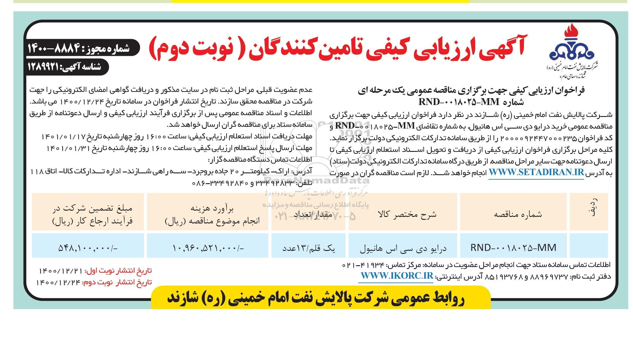 شرکت پالایش نفت امام خمینی (ره) شازند در نظر دارد فراخوان ارزیابی کیفی جهت برگزاری مناقصه عمومی خرید درایو دی سی اس هانیول به شماره RNِD - 0018025- MM و کد فراخوان 2000092447000235 را از طریق سامانه تدارکات الکترونیکی دولت برگزار نماید. کلیه مراحل برگزاری فراخوان ارزیابی کیفی از دریافت و تحویل اسناد استعلام ارزیابی کیفی تا ارسال دعوتنامه جهت سایر مراحل مناقصه از طریق درگاه سامانه تدارکات الکترونیکی دولت ستاد به آدرس ستاد ایران انجام خواهد شد. لازم است مناقصه گران در صورت عدم عضویت قبلی مراحل ثبت نام در سایت مذکور و دریافت گواهی امضای الکترونیکی را جهت شرکت در مناقصه محقق سازند. تاریخ انتشار فراخوان در سامانه تاریخ 1400.12.24 می باشد. اطلاعات و اسناد مناقصه عمومی پس از برگزاری فرآیند ارزیابی کیفی و ارسال دعوتنامه از طریق سامانه ستاد به مناقصه گران ارسال خواهد شد.