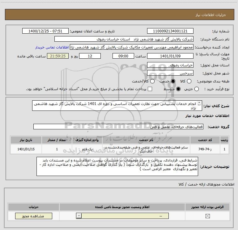 شرح کلی نیاز: انجام خدمات پشتیبانی جهت نظارت تعمیرات اساسی و دوره ای 1401 شرکت پالایش گاز شهید هاشمی نژاد