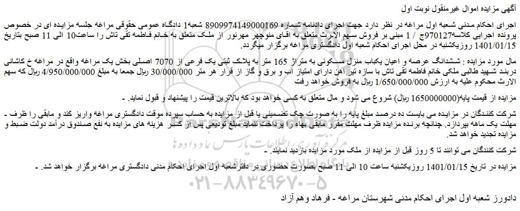 اجرای احکام مدنی شعبه اول مراغه در نظر دارد جهت اجرای دادنامه شماره 8909974149000169 شعبه1 دادگاه عمومی حقوقی مراغه جلسه مزایده ای در خصوص پرونده اجرایی کلاسه970127ج / 1 مبنی بر فروش سهم الارث متعلق به اقای منوچهر مهرنور از ملک متعلق به خانم فاطمه تقی تاش را ساعت10 الی 11 صبح بتاریخ 1401/01/15 روزیکشنبه در محل اجرای احکام شعبه اول دادگستری مراغه برگزار میگردد.