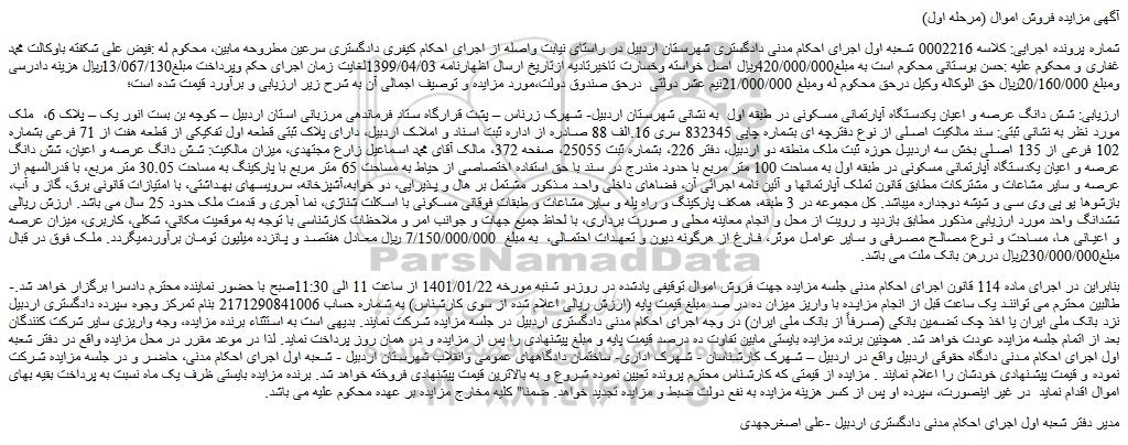 مزایده فروش شش دانگ عرصه و اعیان یکدستگاه آپارتمانی مسکونی در طبقه اول , مزایده فروش شش دانگ عرصه و اعیان یکدستگاه آپارتمانی مسکونی در طبقه اول