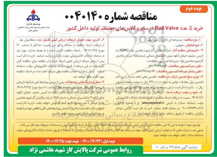مناقصه خرید 5 عدد Ball Valve در سایز و کلاس های مختلف تولید داخل کشور- نوبت دوم از کلیه افراد متخصص و شرکتها واجد شرایط دعوت به عمل میآید در مناقصه با کد خبرگزاری پارس نماد: 4360394 شرکت نمایند.