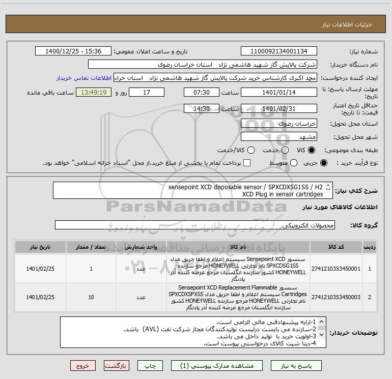 شرح کلی نیاز: sensepoint XCD disposable sensor / SPXCDXSG1SS / H2 XCD Plug in sensor cartridges طبق مشخصات data sheet پیوست