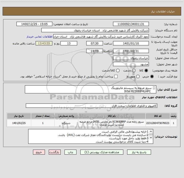 نام دستگاه خریدار:شرکت پالایش گاز شهید هاشمی نژاد استان خراسان رضوی