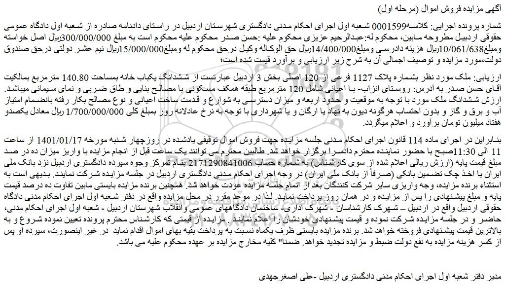 شماره پرونده اجرایی: کلاسه0001599 شعبه اول اجرای احکام مدنی دادگستری شهرستان اردبیل در راستای دادنامه صادره از شعبه اول دادگاه عمومی حقوقی اردبیل مطروحه مابین، محکوم له:عبدالرحیم عزیزی محکوم علیه :حسن صدر محکوم علیه محکوم است به مبلغ 300/000/000ریال اصل خواسته ومبلغ10/061/638ریال هزینه دادرسی ومبلغ14/400/000ریال حق الوکاله وکیل درحق محکوم له ومبلغ15/000/000ریال نیم عشر دولتی درحق صندوق دولت،مورد مزایده و توصیف اجمالی آن به شرح زیر ارزیابی و برآورد قیمت شده است؛