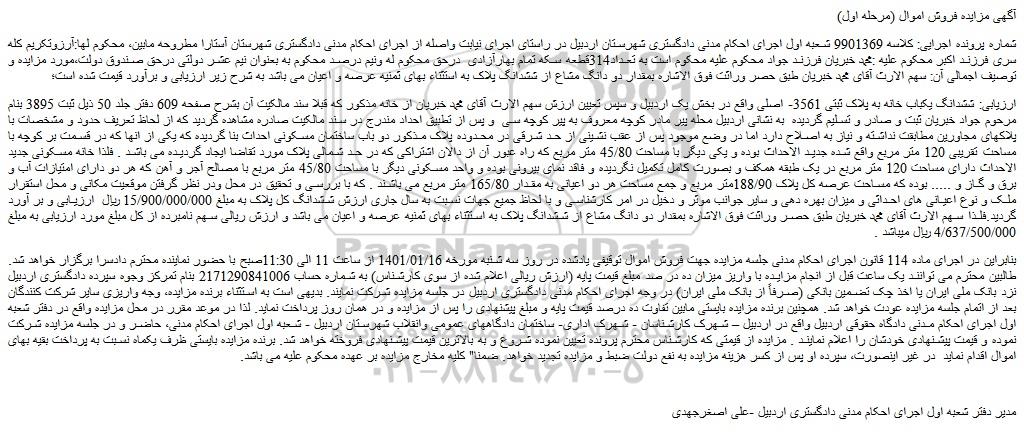 شماره پرونده اجرایی: کلاسه 9901369 شعبه اول اجرای احکام مدنی دادگستری شهرستان اردبیل در راستای اجرای نیابت واصله از اجرای احکام مدنی دادگستری شهرستان آستارا مطروحه مابین، محکوم لها:آرزوتکریم کله سری فرزند اکبر محکوم علیه :محمد خبریان فرزند جواد محکوم علیه محکوم است به تعداد314قطعه سکه تمام بهارآزادی درحق محکوم له ونیم درصد محکوم به بعنوان نیم عشر دولتی درحق صندوق دولت،مورد مزایده و توصیف اجمالی آن: سهم الارث آقای محمد خبریان طبق حصر وراثت فوق الاشاره بمقدار دو دانگ مشاع از ششدانگ پلاک به استثناء بهای ثمنیه عرصه و اعیان می باشد به شرح زیر ارزیابی و برآورد قیمت شده است؛