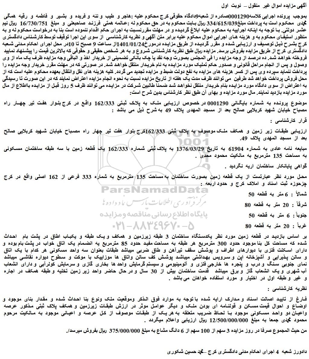 ارزیابی طبقات زیر زمین و همکف ملک موصوف به پلاک ثبتی 162/333کرج بلوار هفت تیر چهار راه مصباح خیابان شهید کربلایی صالح بعد از مسجد المهدی پلاک 49.