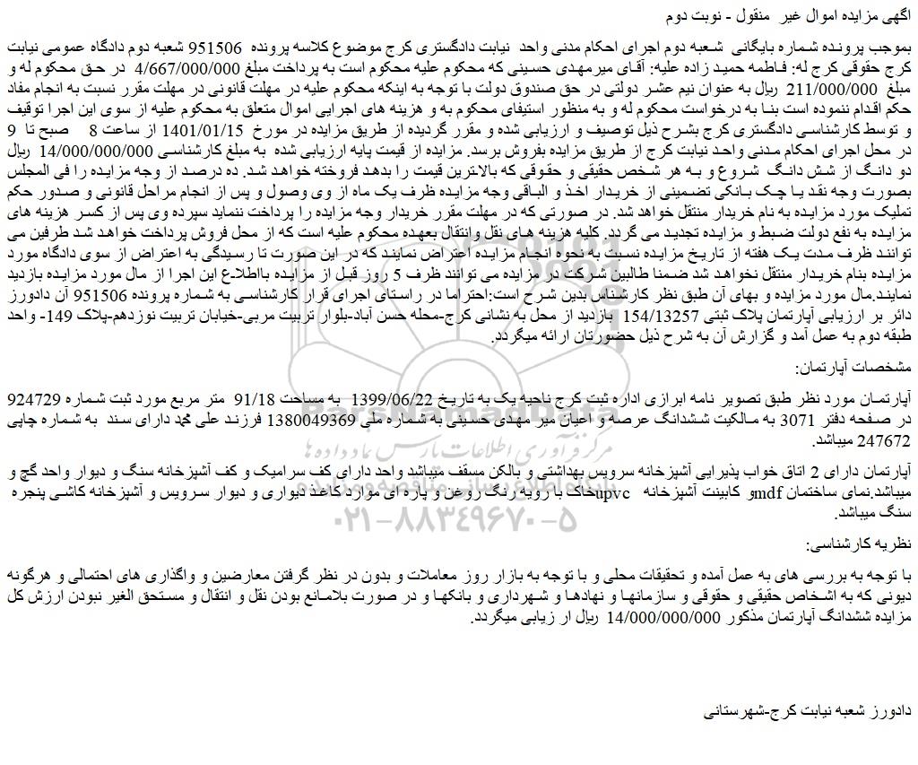 بموجب پرونده شماره بایگانی  شعبه دوم اجرای احکام مدنی واحد  نیابت دادگستری کرج موضوع کلاسه پرونده  951506 شعبه دوم دادگاه عمومی نیابت کرج حقوقی کرج له: فاطمه حمید زاده علیه: آقای میرمهدی حسینی که محکوم علیه محکوم است به پرداخت مبلغ 4/667/000/000  در حق محکوم له و مبلغ  211/000/000  ریال به عنوان نیم عشر دولتی در حق صندوق دولت با توجه به اینکه محکوم علیه در مهلت قانونی در مهلت مقرر نسبت به انجام مفاد حکم اقدام ننموده است بنا به درخواست محکوم له و به منظور استیفای محکوم به و هزینه های اجرایی اموال متعلق به محکوم علیه از سوی این اجرا توقیف و توسط کارشناسی دادگستری کرج بشرح ذیل توصیف و ارزیابی شده و مقرر گردیده از طریق مزایده در مورخ  1401/01/15 از ساعت 8    صبح تا  9 در محل اجرای احکام مدنی واحد نیابت کرج از طریق مزایده بفروش برسد. مزایده از قیمت پایه ارزیابی شده  به مبلغ کارشناسی 14/000/000/000  ریال دو دانگ از شش دانگ  شروع و به هر شخص حقیقی و حقوقی که بالاترین قیمت را بدهد فروخته خواهد شد. ده درصد از وجه مزایده را فی المجلس بصورت وجه نقد یا چک بانکی تضمینی از خریدار اخذ و الباقی وجه مزایده ظرف یک ماه از وی وصول و پس از انجام مراحل قانونی و صدور حکم تملیک مورد مزایده به نام خریدار منتقل خواهد شد. در صورتی که در مهلت مقرر خریدار وجه مزایده را پرداخت ننماید سپرده وی پس از کسر هزینه های مزایده به نفع دولت ضبط و مزایده تجدید می گردد. کلیه هزینه های نقل وانتقال بعهده محکوم علیه است که از محل فروش پرداخت خواهد شد طرفین می توانند ظرف مدت یک هفته از تاریخ مزایده نسبت به نحوه انجام مزایده اعتراض نمایند که در این صورت تا رسیدگی به اعتراض از سوی دادگاه مورد مزایده بنام خریدار منتقل نخواهد شد ضمنا طالبین شرکت در مزایده می توانند ظرف 5 روز قبل از مزایده بااطلاع این اجرا از مال مورد مزایده بازدید نمایند.مال مورد مزایده و بهای آن طبق نظر کارشناس بدین شرح است:احتراما در راستای اجرای قرار کارشناسی به شماره پرونده 951506 آن دادورز دائر بر ارزیابی آپارتمان پلاک ثبتی 154/13257  بازدید از محل به نشانی کرج-محله حسن آباد-بلوار تربیت مربی-خیابان تربیت نوزدهم-پلاک 149- واحد طبقه دوم به عمل آمد و گزارش آن به شرح ذیل حضورتان ارائه میگردد.