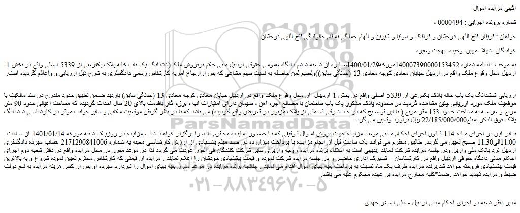 ،به موجب دادنامه شماره 140007390000153452مورخه1400/01/29صادره از شعبه ششم دادگاه عمومی حقوقی اردبیل مبنی حکم برفروش ملک(ششدانگ یک باب خانه پلاک یکفرعی از 5339 اصلی واقع در بخش 1 اردبیل محل وقوع ملک واقع در اردبیل خیابان معادی کوچه معادی 13 (خدنگی سابق))وتقسیم ثمن حاصله به نسبت سهم مشاعی که پس ازارجاع امربه کارشناس رسمی دادگستری به شرح ذیل ارزیابی و واعلام گردیده است.