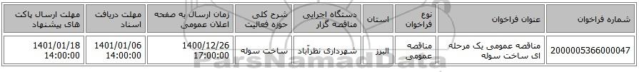 | 2000005366000047 | مناقصه عمومی یک مرحله ای ساخت سوله | مناقصه عمومی | البرز | شهرداری نظرآباد | ساخت سوله | 1400/12/26 17:00:00 | 1401/01/06 14:00:00 | 1401/01/18 14:00:00 |