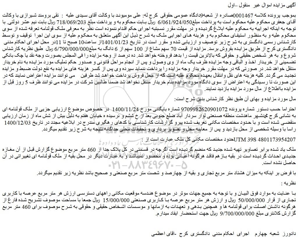 بموجب پرونده کلاسه 0001467صادره از شعبه9دادگاه عمومی حقوقی کرج له: علی مومیوند با وکالت آقای سیدی علیه : تقی برومند شیرازی با وکالت آقای جعفری محکوم علیه محکوم است به پرداخت مبلغ6/061/924/050 ریال بابت محکوم به و پرداخت مبلغ 718/069/203 ریال بابت نیم عشر دولتی. با توجه به اینکه اجراییه به محکوم علیه ابلاغ گردیده و در مهلت مقرر نسبتبه اجرای حکم اقدام ننموده است نظر به معرفی ملک قولنامه تعرفه شده از سوی محکوم علیه و به منظور استیفای محکوم به و هزینه های اجرایی ملک به شرح ذیل این آگهی متعلق به محکوم علیه از سوی این اجرا توقیف و توسط کارشناس رسمی دادگستری به شرح زیر توصیف و ارزیابی شده و مقرر است در تاریخ 1401/01/23از ساعت10 صبح تا 11در محل اجرای احکام مدنی دادگستری کرج از طریق مزایده بفروش برسد. مزایده از قیمت 70 سهم مشاع از 100 سهم از 6 دانگ به مبلغ6/790/000/000 ریال طبق نظریه کارشناس شروع و به هر شخص حقیقی و حقوقی که بالاترین قیمت را بدهد فروخته خواهد شد. ده درصد از وجه مزایده را فی المجلس بصورت وجه نقد یا چک بانکی تضمینی از خریدار اخذ و الباقی وجه مزایده ظرف یک ماه از وی وصول و پس از انجام مراحل قانونی و صدور حکم تملیک مورد مزایده به نام خریدار منتقل خواهد شد. در صورتی که در مهلت مقرر خریدار وجه مزایده را پرداخت ننماید سپرده وی پس از کسر هزینه های مزایده به نفع دولت ضبط و مزایده تجدید می گردد. کلیه هزینه های نقل وانتقال بعهده محکوم علیه است که از محل فروش پرداخت خواهد شد طرفین می توانند مزایده اعتراض نمایند که در این صورت تا رسیدگی به اعتراض از سوی دادگاه مورد مزایده بنام خریدار منتقل نخواهد شد ضمنا طالبین شرکت در مزایده می توانند ظرف 5 روز قبل از مزایده بااطلاع از مال مورد مزایده بازدید نمایند.