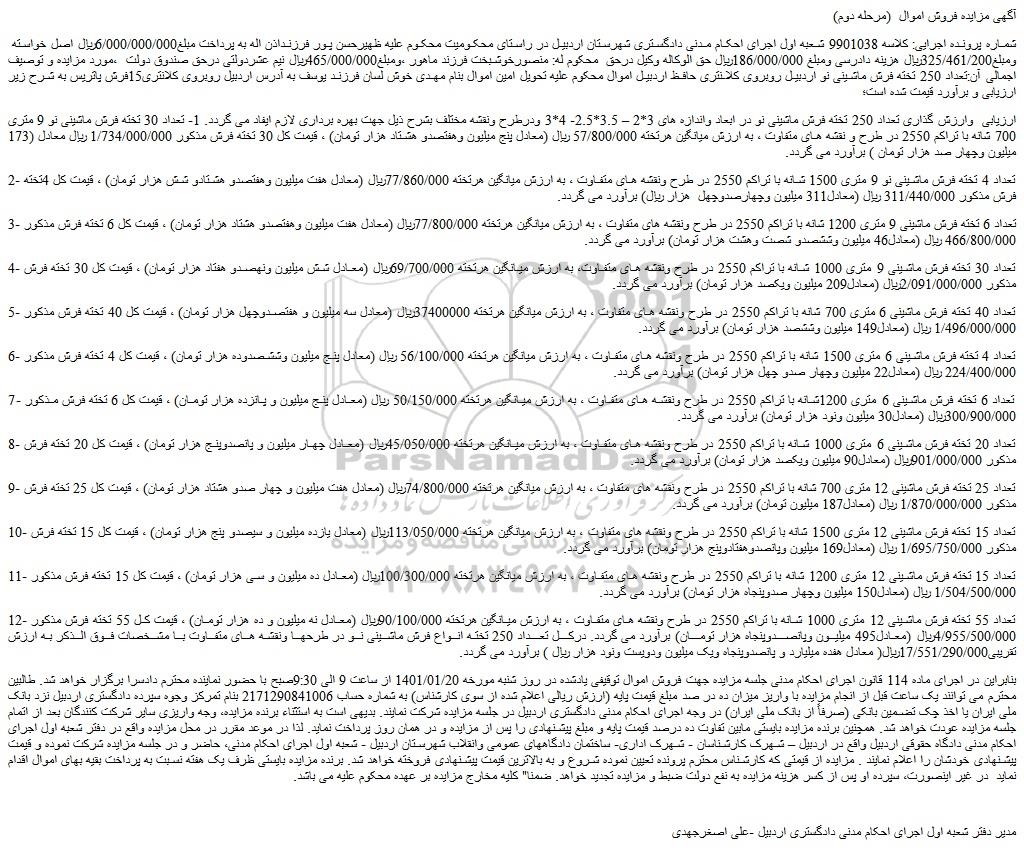 شماره پرونده اجرایی: کلاسه 9901038 شعبه اول اجرای احکام مدنی دادگستری شهرستان اردبیل در راستای محکومیت محکوم علیه ظهیرحسن پور فرزنداذن اله به پرداخت مبلغ6/000/000/000ریال اصل خواسته ومبلغ325/461/200ریال هزینه دادرسی ومبلغ 186/000/000ریال حق الوکاله وکیل درحق محکوم له: منصورخوشبخت فرزند ماهور ،ومبلغ465/000/000ریال نیم عشردولتی درحق صندوق دولت ،مورد مزایده و توصیف اجمالی آن:تعداد 250 تخته فرش ماشینی نو اردبیل روبروی کلانتری حافظ اردبیل اموال محکوم علیه تحویل امین اموال بنام مهدی خوش لسان فرزند یوسف به آدرس اردبیل روبروی کلانتری15فرش پاتریس به شرح زیر ارزیابی و برآورد قیمت شده است؛