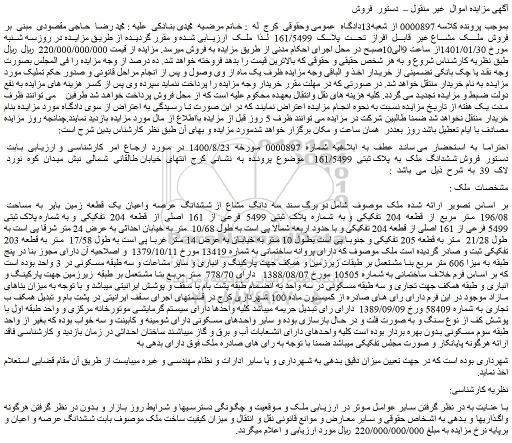 بموجب پرونده کلاسه 0000897 از شعبه13دادگاه  عمومی وحقوقی  کرج  له  : خانم مرضیه  محمدی بنادکی  علیه : محمد رضا  حاجی مقصودی  مبنی  بر فروش  ملک  مشاع غیر  قابل  افراز  تحت  پلاک  161/5499  لذا  ملک  ارزیابی شده و مقرر گردیده از طریق مزایده در روزسه شنبه مورخ 1401/01/30از ساعت 9الی10صبح در محل اجرای احکام مدنی از طریق مزایده به فروش میرسد. مزایده از قیمت 220/000/000/000  ریال  ریال طبق نظریه کارشناس شروع و به هر شخص حقیقی و حقوقی که بالاترین قیمت را بدهد فروخته خواهد شد. ده درصد از وجه مزایده را فی المجلس بصورت وجه نقد یا چک بانکی تضمینی از خریدار اخذ و الباقی وجه مزایده ظرف یک ماه از وی وصول و پس از انجام مراحل قانونی و صدور حکم تملیک مورد مزایده به نام خریدار منتقل خواهد شد. در صورتی که در مهلت مقرر خریدار وجه مزایده را پرداخت ننماید سپرده وی پس از کسر هزینه های مزایده به نفع دولت ضبط و مزایده تجدید می گردد. کلیه هزینه های نقل وانتقال بعهده محکوم علیه است که از محل فروش پرداخت خواهد شد طرفین    می توانند ظرف مدت یک هفته از تاریخ مزایده نسبت به نحوه انجام مزایده اعتراض نمایند که در این صورت تا رسیدگی به اعتراض از سوی دادگاه مورد مزایده بنام خریدار منتقل نخواهد شد ضمنا طالبین شرکت در مزایده می توانند ظرف 5 روز قبل از مزایده بااطلاع از مال مورد مزایده بازدید نمایند.چنانجه روز مزایده مصادف با ایام تعطیل باشد روز بعددر  همان ساعت و مکان برگزار خواهد شدمورد مزایده و بهای آن طبق نظر کارشناس بدین شرح است: