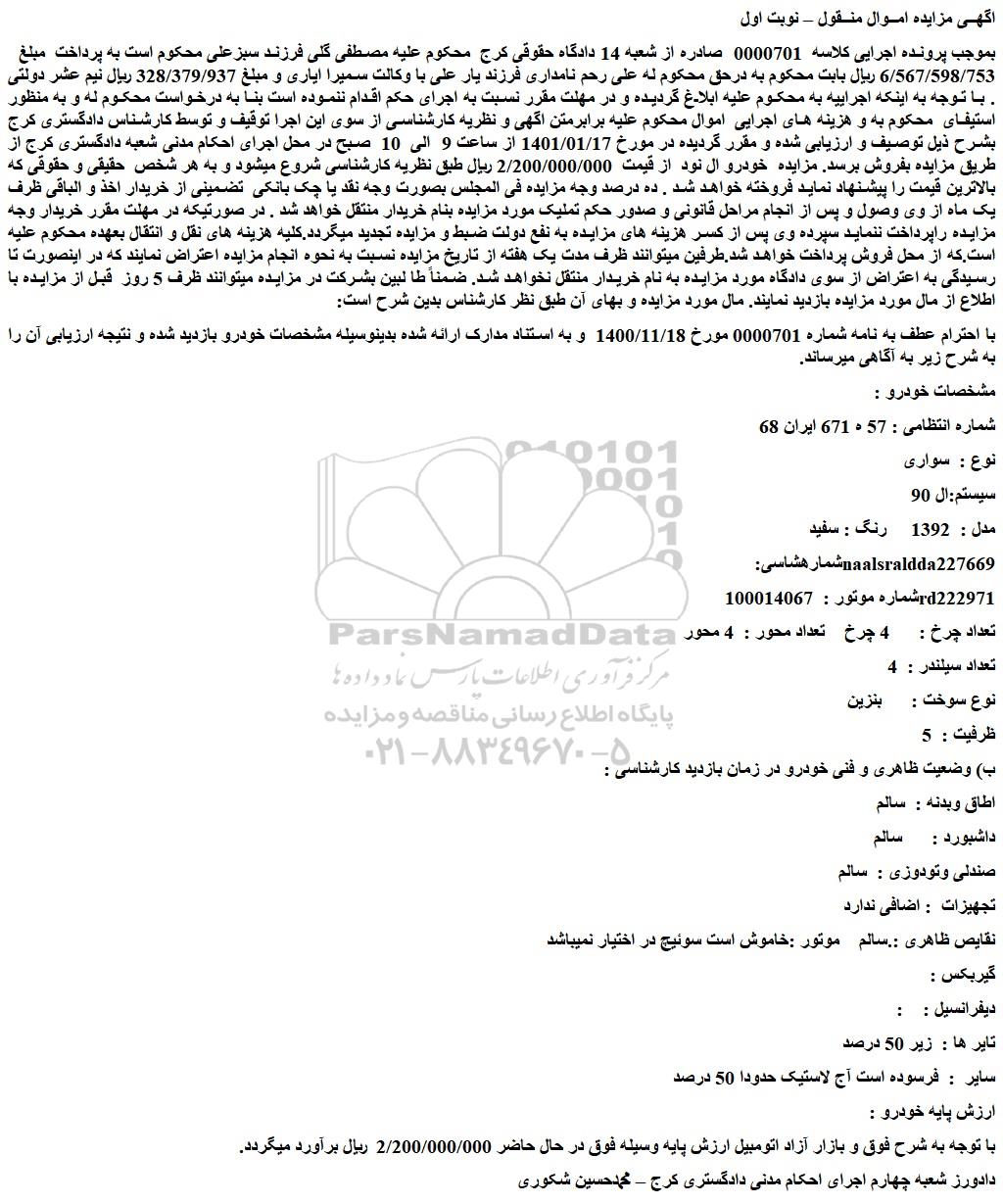 بموجب پرونده اجرایی کلاسه 0000701 صادره از شعبه 14 دادگاه حقوقی کرج محکوم علیه مصطفی گلی فرزند سبزعلی محکوم است به پرداخت مبلغ 6/567/598/753 ریال بابت محکوم به درحق محکوم له علی رحم نامداری فرزند یار علی با وکالت سمیرا ایاری و مبلغ 328/379/937 ریال نیم عشر دولتی . با توجه به اینکه اجراییه به محکوم علیه ابلاغ گردیده و در مهلت مقرر نسبت به اجرای حکم اقدام ننموده است بنا به درخواست محکوم له و به منظور استیفای محکوم به و هزینه های اجرایی اموال محکوم علیه برابرمتن اگهی و نظریه کارشناسی از سوی این اجرا توقیف و توسط کارشناس دادگستری کرج بشرح ذیل توصیف و ارزیابی شده و مقرر گردیده در مورخ 1401/01/17 از ساعت 9 الی 10 صبح در محل اجرای احکام مدنی شعبه دادگستری کرج از طریق مزایده بفروش برسد. مزایده خودرو ال نود از قیمت 2/200/000/000 ریال طبق نظریه کارشناسی شروع میشود و به هر شخص حقیقی و حقوقی که بالاترین قیمت را پیشنهاد نماید فروخته خواهد شد . ده درصد وجه مزایده فی المجلس بصورت وجه نقد یا چک بانکی تضمینی از خریدار اخذ و الباقی ظرف یک ماه از وی وصول و پس از انجام مراحل قانونی و صدور حکم تملیک مورد مزایده بنام خریدار منتقل خواهد شد . در صورتیکه در مهلت مقرر خریدار وجه مزایده راپرداخت ننماید سپرده وی پس از کسر هزینه های مزایده به نفع دولت ضبط و مزایده تجدید میگردد.کلیه هزینه های نقل و انتقال بعهده محکوم علیه است.که از محل فروش پرداخت خواهد شد.طرفین میتوانند ظرف مدت یک هفته از تاریخ مزایده نسبت به نحوه انجام مزایده اعتراض نمایند که در اینصورت تا رسیدگی به اعتراض از سوی دادگاه مورد مزایده به نام خریدار منتقل نخواهد شد. ضمناً طا لبین بشرکت در مزایده میتوانند ظرف 5 روز قبل از مزایده با اطلاع از مال مورد مزایده بازدید نمایند. مال مورد مزایده و بهای آن طبق نظر کارشناس بدین شرح است: