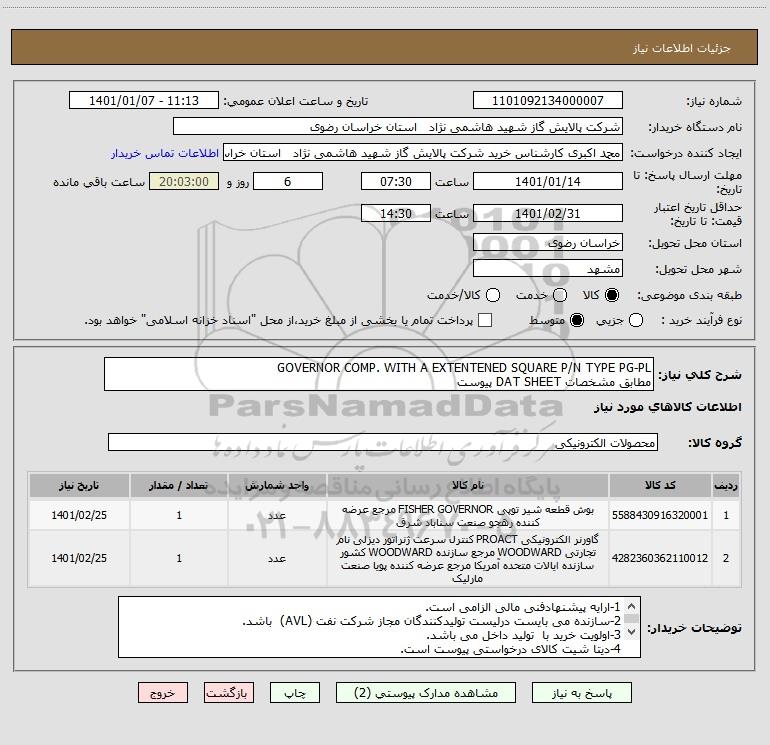 نام دستگاه خریدار:شرکت پالایش گاز شهید هاشمی نژاد استان خراسان رضوی