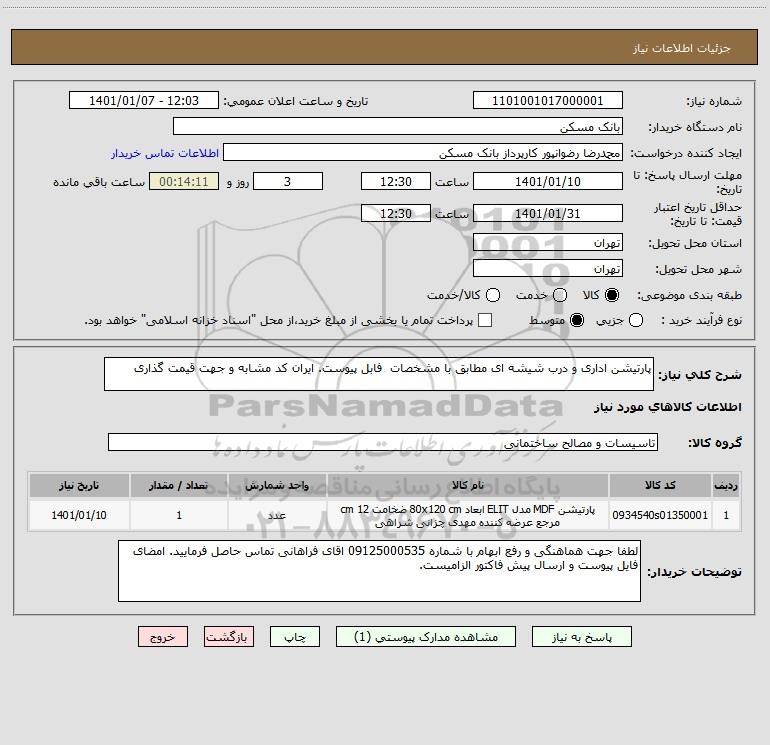 شرح کلی نیاز: پارتیشن اداری و درب شیشه ای مطابق با مشخصات فابل پیوست. ایران کد مشابه و جهت قیمت گذاری