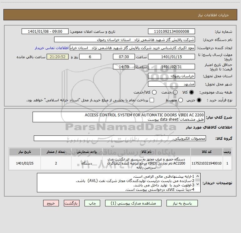 شرح کلی نیاز: ACCESS CONTROL SYSTEM FOR AUTOMATIC DOORS VIRDI AC 2200 طبق مشخصات data sheet پیوست
