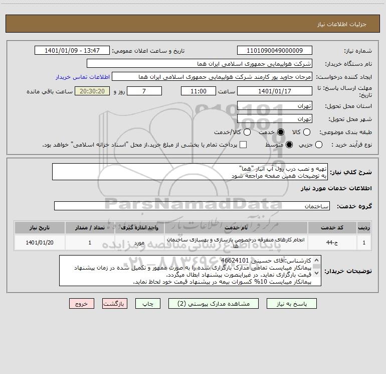 شرح کلی نیاز: تهیه و نصب درب رول آپ انبار "هما"